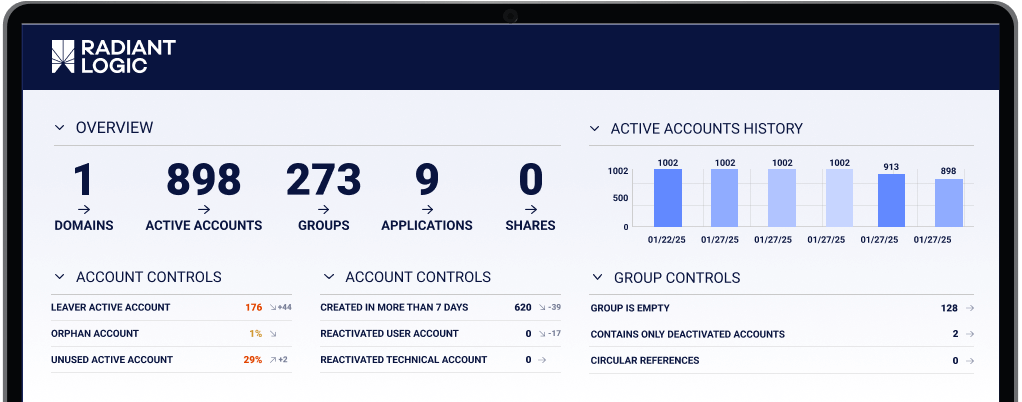 RadiantOne’s AI-driven intelligence proactively surfaces identity risks, supports compliance readiness, and empowers informed remediation decisions, accelerating your organization’s digital transformation.